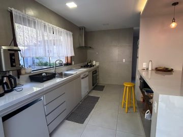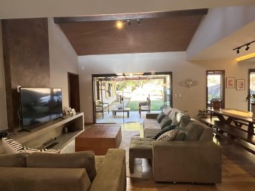 Um belo jardim linear gramado são o cartão de visitas da propriedade que é composta de ampla sala em 2 ambientes com pé-direito duplo, cozinha integrada com ilha e varandas com pergolados envidraçados que valorizam a iluminação natural.
