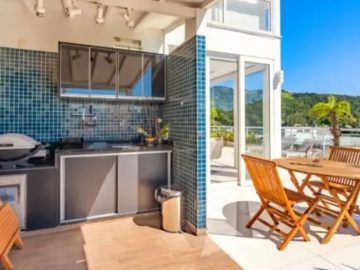 No terceiro pavimento um belo terraço com vista deslumbrante, piscina e cozinha de apoio com armários. Lavanderia. Quatro vagas de garagem demarcadas.
