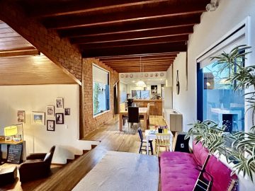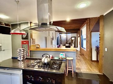 -Sala de jantar com cozinha em conceito aberto e linda vista